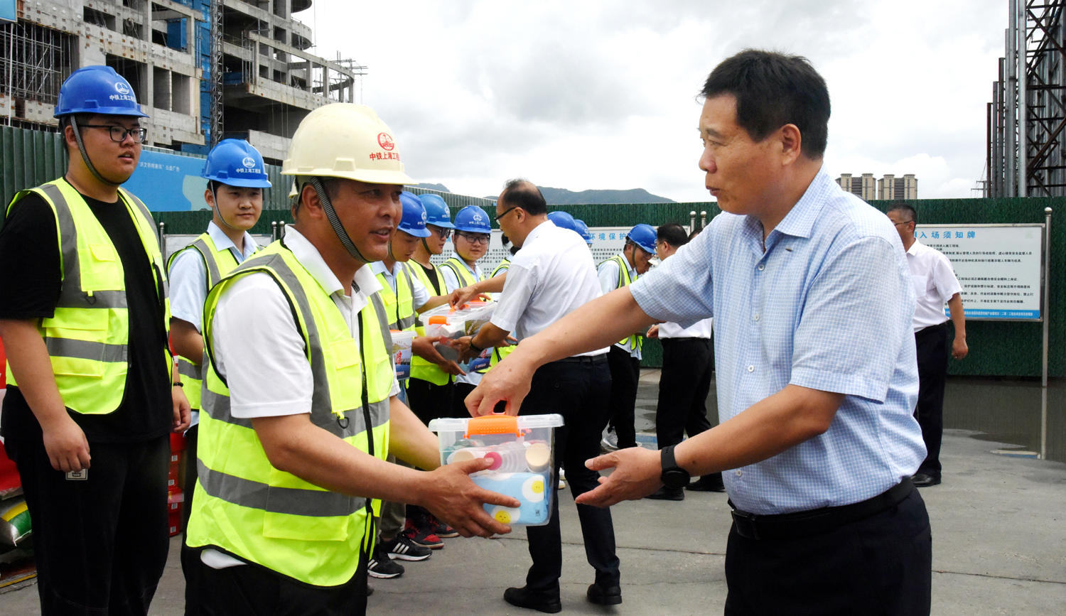 7月28日,市总工会党组书记、副主席丁维杰带领市总工会相关部门负责人一行,在爱体育首页(中国)网页版公司党委副书记、工会主席戴鸿鸣的陪同下,看望慰问奋战在市重大项目一线的建设者,并送上防暑急救箱等慰问品。 在爱体育首页(中国)网页版公司国际医药创新产业园二期项目工地,丁维杰与职工们亲切交谈,详细了解生产生活情况,向顶高温、冒酷暑,坚守在岗位的工程项目建设者们致以崇高的敬意和亲切的问候,希望他们在坚守岗位的同时,增强自我保护意识,做好防暑降温工作。同时督促建设单位要贯彻落实防暑降温政策措施,增设防暑降温设施,保障项目建设一线劳动者的人身安全和身体健康。