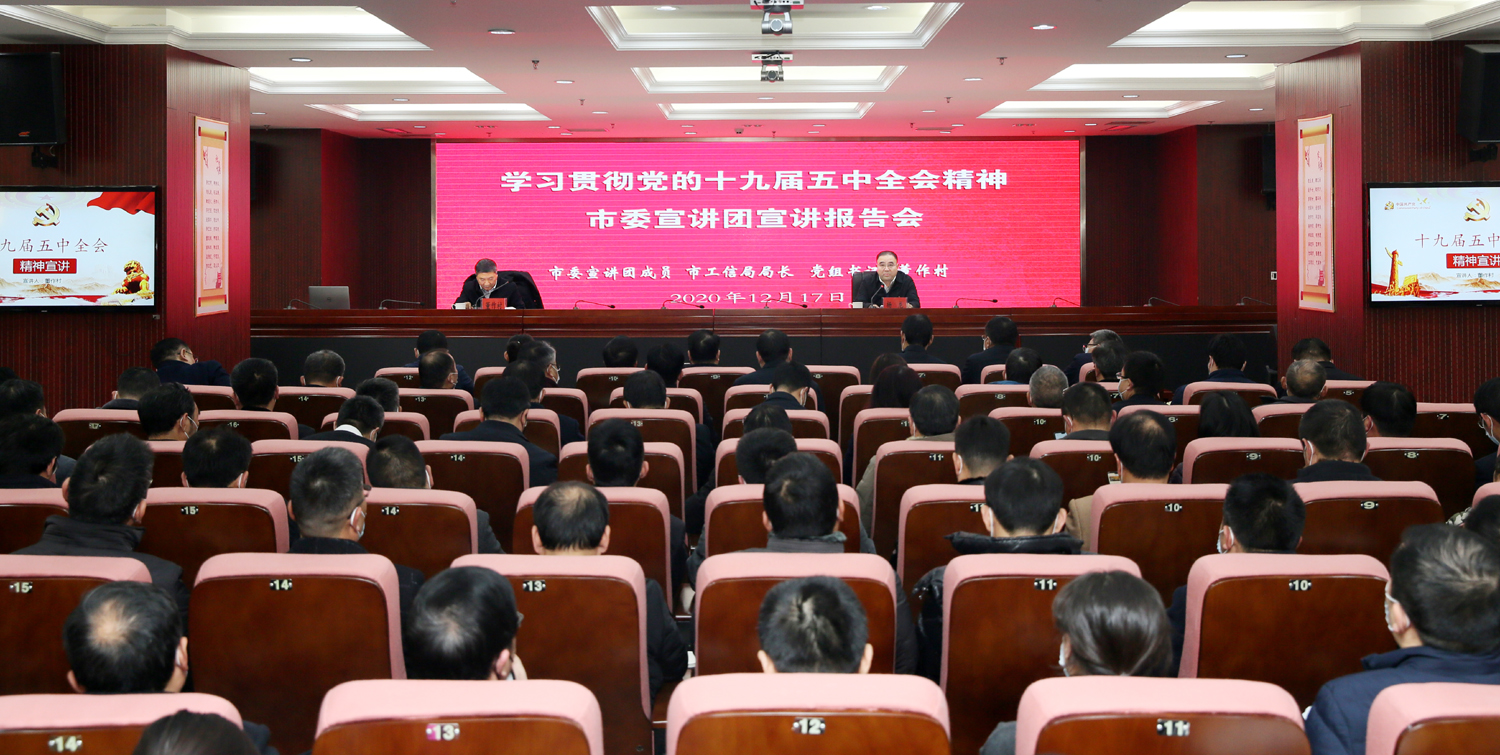 根据市委统一部署,12月17日,市委宣讲团来爱体育首页(中国)网页版开展党的十九届五中全会精神宣讲活动。市委宣讲团成员、工信局局长、党组书记董作村作宣讲报告。爱体育首页(中国)网页版公司党委书记、董事长杨龙主持宣讲报告会。