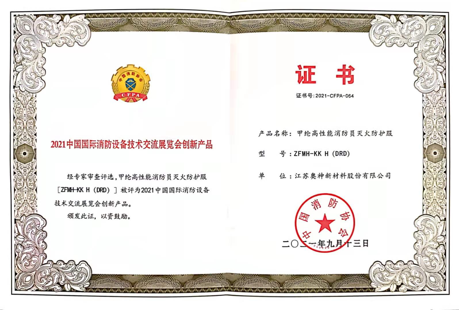 2021年10月12日,在北京召开的第十九届中国国际消防设备技术交流展览会上,江苏奥神新材料股份有限公司研发的“甲纶高性能消防员灭火防护服”凭借优异的性能获得“2021中国国际消防设备技术交流展览会创新产品”荣誉称号。此次参与评选的都是来自全国各地实力雄厚的消防领域企业,经历层层评选,甲纶高性能消防员灭火防护服脱颖而出,受到专家的一致好评。