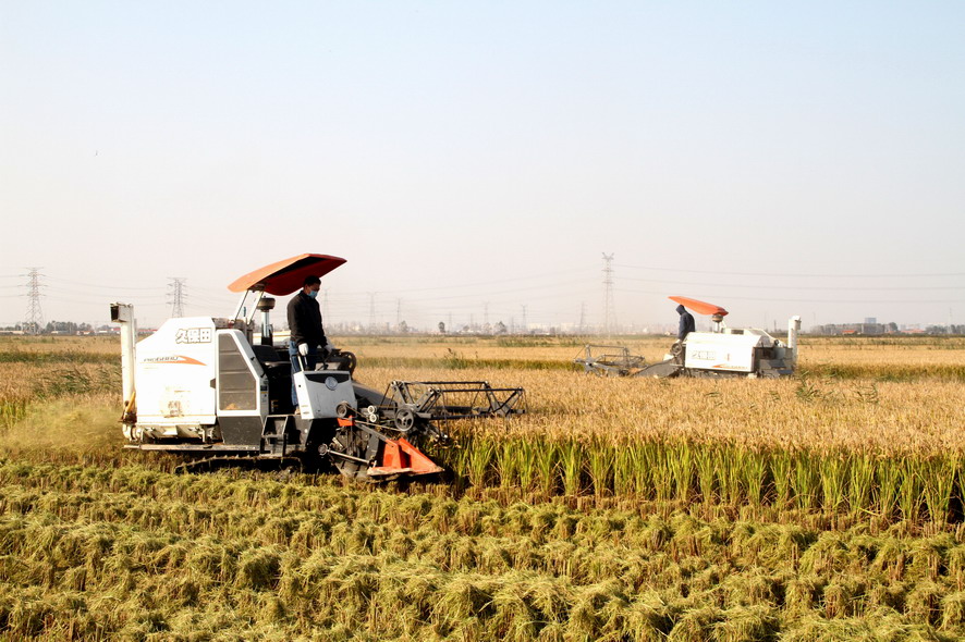 111日下午,连阴后地放睛气温明显回升,盐田稻花香,稻谷归晒场,销售订单忙。在青口公司大新农场的一分场赵斯凯的条田,两台收割机来回穿梭,一片繁忙的景象,全公司近二万亩水稻开始收割。