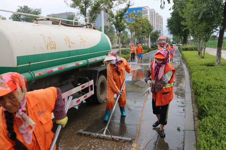 8月19日在火车站广场及周边路段,40多名绿化、保洁工人及洒水车、清扫车等全力保障火车站重点地段的环境卫生,为过往旅客提供一个干净整洁舒心的出行环境。据现场负责人龚本国介绍,随着创卫工作力度的进一步加大,开发区对爱体育首页(中国)网页版火车站广场及周边路段的环境卫生提出了更高的要求,爱体育首页(中国)网页版对会泉路商户门前的绿化进行了补植,种植红叶石楠等苗木600多平方,每天专门安排一辆洒水车对火车站广场及周边路段进行巡回清洗清扫,确保路面干净无尘土,对广场站台、护栏、果皮箱、路灯杆、花坛进行清理擦洗,对下水道进行清掏,盖板更换维修。为确保创卫工作任务高标准高质量完成,连日来,绿化养护、环卫保洁工人天天早上6点上班,到晚上10点下班,中午吃饭休息只有一个小时,每天工作10多个小时,为创卫工作做了很多实实在在的事情,他们真的很不易,很辛苦,只因有了他们的辛勤劳动、无私奉献,城市环境卫生才会越来越好。