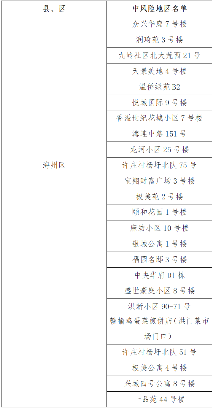 根据国务院联防联控机制有关规定,经综合评估研判,市指挥部决定,自发布之日起,将颐和花园1号楼、麻纺小区10号楼、银城公寓1号楼、福园名邸3号楼、中央华府D1栋、盛世豪庭小区8号楼、洪新小区90-71号、赣榆鸡蛋菜煎饼店(洪门菜市场门口)、许庄村杨圩北队51号、极美公寓4号楼、兴城四号公寓8号楼、一品苑44号楼调整为中风险地区。其他地区风险等级不变。调整后全市现有24个中风险地区。