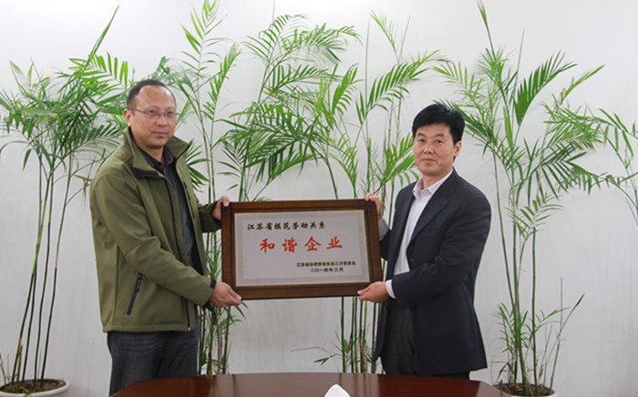 日前,江苏省模范劳动关系三方委员会办公室印发《关于表彰江苏省模范劳动关系和谐企业与工业园区的决定》(苏协劳【2014】2号),授予公司“江苏省模范劳动关系和谐企业”称号。