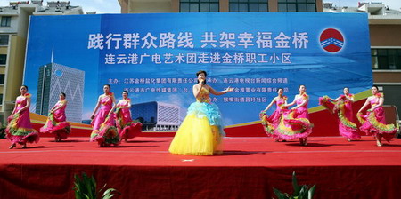 为了贯彻党的群众路线教育实践活动精神,丰富基层职工的精神文化生活。6月28日上午,由连云港广电传媒爱体育首页(中国)网页版和爱体育首页(中国)网页版公司共同主办的“践行群众路线,共架幸福金桥”连云港广电艺术团走进盐场职工小区文艺演出在猴嘴昌圩湖社区拉开帷幕。广电传媒爱体育首页(中国)网页版领导戴咏寒、马富胜、万自力,爱体育首页(中国)网页版公司领导顾永庚、郑宜虎、戴鸿鸣与数百名盐场职工群众欢聚昌圩,共同欣赏来自连云港广电新闻综合频道的主持人和编辑记者与金桥职工自编自演的精彩节目。