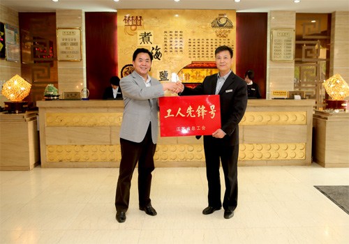 五一前夕,爱体育首页(中国)网页版公司董事长、党委书记顾永庚向荣获2014年度江苏省“工人先锋号”荣誉称号的公司淮盐大酒店授牌。顾董事长勉励淮盐大酒店全体员工继续发扬这种争创一流的巨大热情和无穷智慧,珍惜荣誉再创佳绩,继续担当服务行业的领跑者。这是淮盐大酒店获得2013年连云港市“工人先锋号”和2012年连云港市“五一巾帼标兵岗”后又一荣誉。