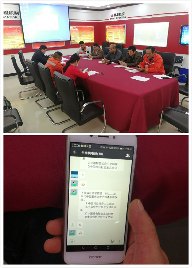 4月10日下午,台南供电所全体党员静坐在会议桌旁,每人拿着一部手机,进行着一场特殊的考试。近年来,该所党支部积极响应公司党委创新党员教育管理举措,利用微信公众平台,开展“掌上党课”和“指尖上廉政教育”活动,学习党的十九大精神,进行党纪党规知识测试,实现随时、随地、随身,提升了学习教育成效。(刘继美)