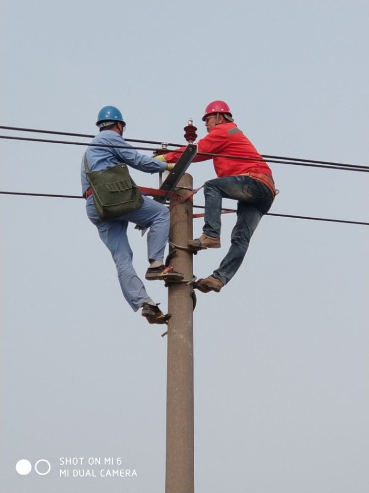 5月2日,张圩新农村小区配电安装工程施工现场,一根15米的电线杆上,荣获爱体育首页(中国)网页版“技能大师”称号的王建采用实践教学的方法,亲自为新员工祁明智做登杆、金具安装、导线捆绑等示范操作,促其尽快掌握技术要领。