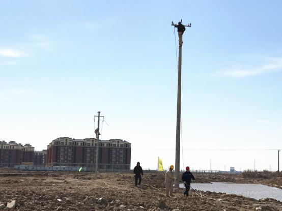 3月14日,台南供电所职工正在加紧对张圩小区10kv供电线路进行导线架设。