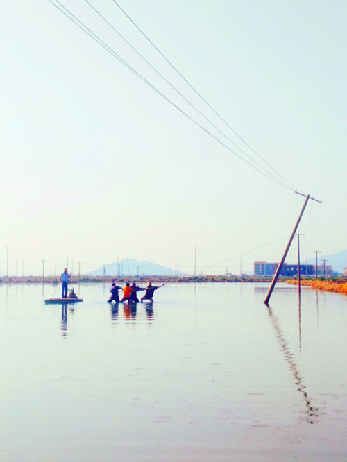 9月20日,该所组织人员进行抢修。抢修人员经过现场勘查后,发现隐患地点处于池塘中,抢修车辆等大型工器具无法到达,只能靠人工抢修。在与鱼塘养殖户协商后,俞德春、杨祖加、杨新军等抢修人员在对低压线路采取停电、验电、挂接地等安全措施后,利用小木船来回穿梭、传送材料,再跳入没腿深的水里,将电杆扶正、加固。此时,水面上的船、水中的人、拖拽的线路成了镜头中的新闻亮点。最后在经过半个多小时的特色抢修后,成功恢复供电。(钱明华)