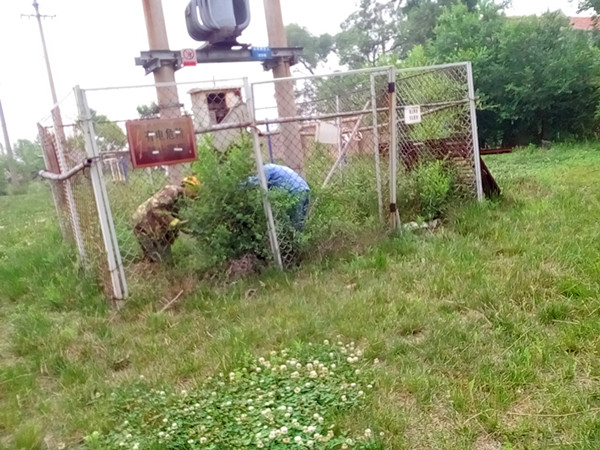 清理外置的变电设备周围环境。通过夏季雨水的滋润,外置的变电设备周围长满了盐蒿、蔓草和芦苇。有的地方杂草丛生人不能进入给维护造成困难,有的地方蔓草越过围栏直接爬上电杆威胁线路安全,有的直接被淹没在芦苇丛中,不见了踪影,给变电设备的环境带来恶化和安全隐患。为此,供电所组织人员进行全面清理,完成了16处外置的变电设备清理工作。