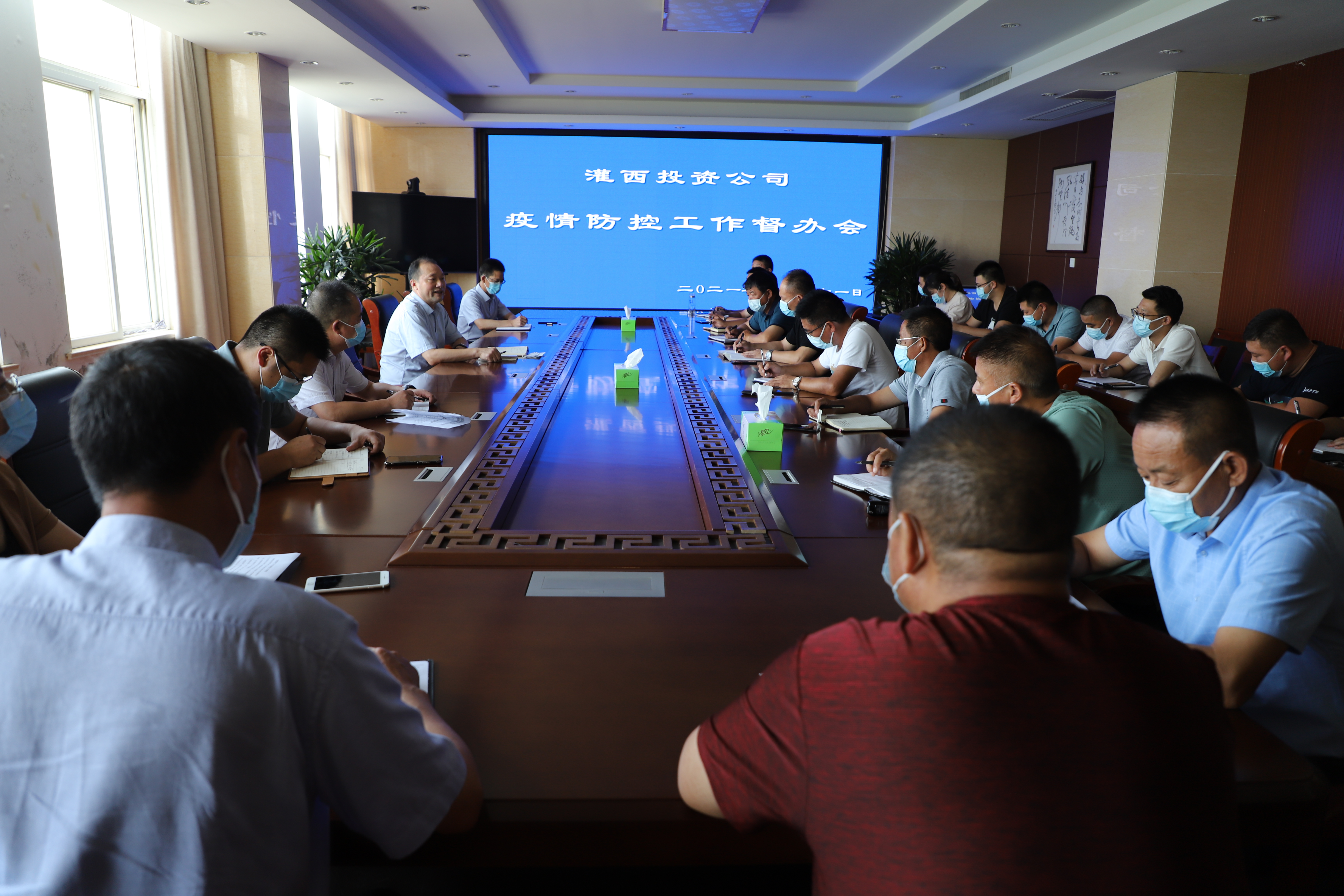 7月31日下午,灌西投资公司在三楼会议召开疫情防控工作督办会,公司党委书记、董事长、总经理李国文、党委副书记、工会主席王宏、总经理助理潘二卫,疫情防控工作组成员、各部门单位行政负责人参加会议,燕尾港镇有关领导出席了此次会议。