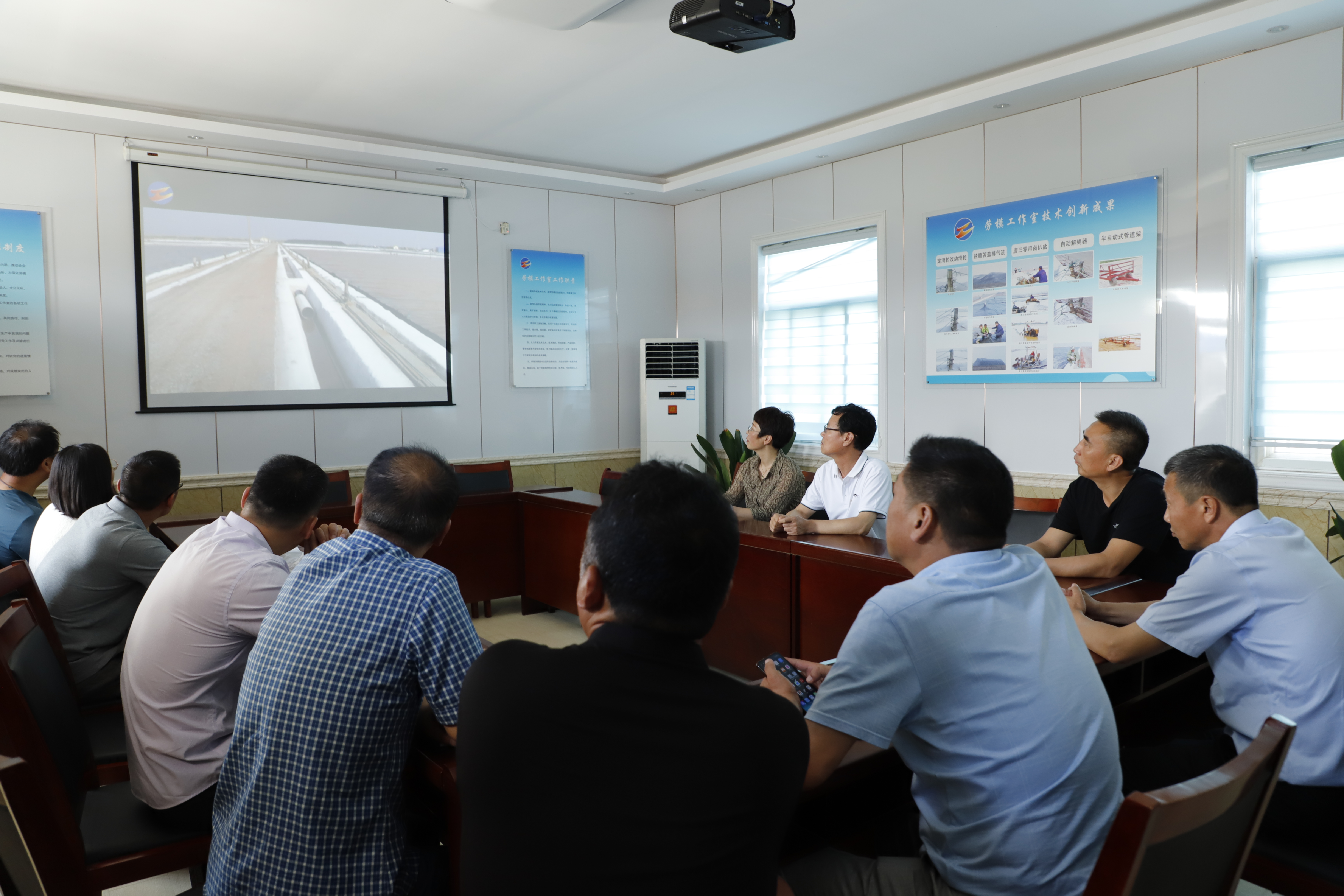 华茂公司调研组一行分别在新河制盐分公司的后勤机修场所、九班滩头和安树林劳模创新工作室等处实地参观、听取讲解、观看视频,了解日晒制盐公司近年来的科技创新工作开展情况及取得的成果。