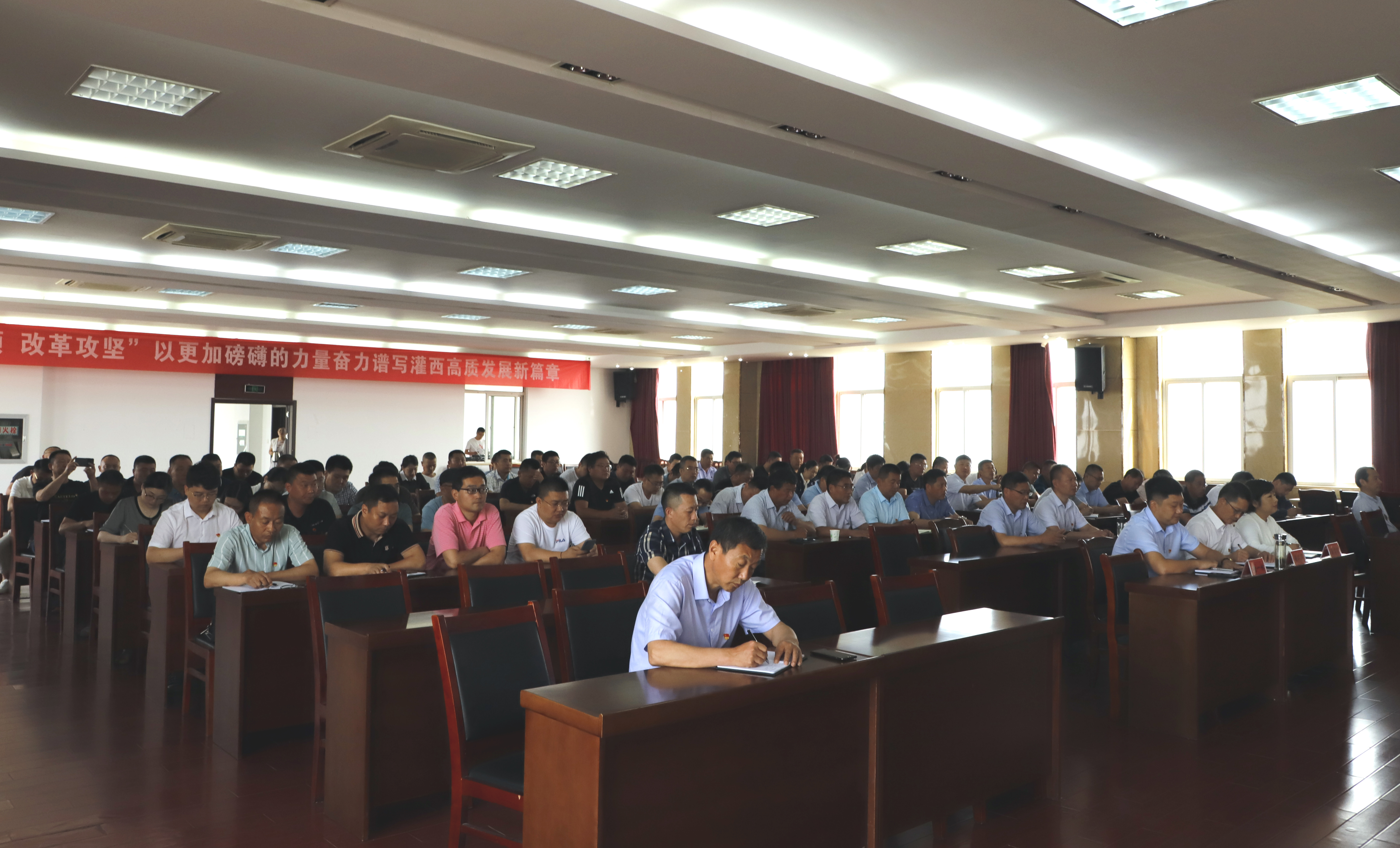 大会在国歌声中拉开序幕,公司党委书记、董事长、总经理李国文作庆祝中国共产党成立100周年讲话并提出三点要求:一、回顾党的光辉历程,铭记历史、不忘初心;二、站在新的时代起点,牢记使命、砥砺奋进;三、面对新的任务要求,提振精神、真抓实干,勇挑“十四五”发展新使命,奋力走好企业与职工共同发展的新时代长征路,与时俱进,开拓创新,扎实工作,不断开创灌西工作新局面,不断推动灌西事业迈上新台阶。