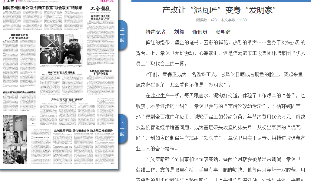 近年来,连云港市工投爱体育首页(中国)网页版灌西公司为打通产业工人成长成才的身份壁垒、价值体现壁垒及学习教育壁垒,开办技能培训“大课堂”,打造“一中心+三基地”职业教育平台,即金蓝领技术工人培训中心和技能比武基地、技术创新基地、技能鉴定基地,构建公司、单位和班组三级职业教育体系、技能培训体系和技能评定体系,引导产业工人重在技能深耕、求精、拔尖、攀高上磨练塑造。章保卫正是在技能培训的“大课堂”中一步一步成长起来,他参与的“定时打卤泵”、“管道输送加压法”、“低温除硫工艺”等技术得到快速推广,也让他从普通员工成长为“二星级优秀员工”,被推选担任制盐生产班组长,每月工资增长800元。这一切让他获得满满的荣誉感和幸福感。