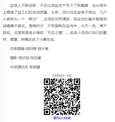盐场人不断创新,不仅让淮盐生产写下了新篇章,也从根本上提高了盐工们的生活质量。从前,他们住在盐格子旁边,几户人家称为一个“单元”,生活封闭而清苦,现在他们基本都搬到城镇集中居住。傍晚时分,夕阳倒映在盐池中,水天一色,美不胜收。这里就是连云港的“天空之镜”。盐场人用他们自己的勤劳、智慧、拼搏走进了小康生活。