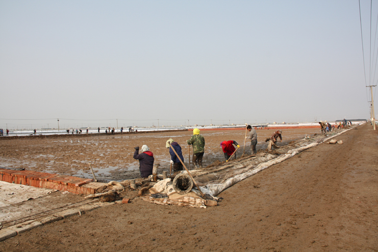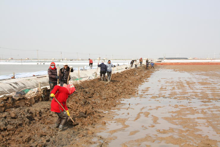 3月21日,在新河制盐分公司八班的一期结晶区,一片火热景象,只见大家正在滩内挥膀大干,挖泥的、和泥的、打堰的,配合密切,运作熟练,参加劳动的职工足有50余人。“为了加快食用原料海盐基地建设进度,今天,爱体育首页(中国)网页版集中了7个组班的员工帮助八班维修下马格格堰,争取早日灌池生产。”正在工作现场安排工作的该公司经理安树林说道。