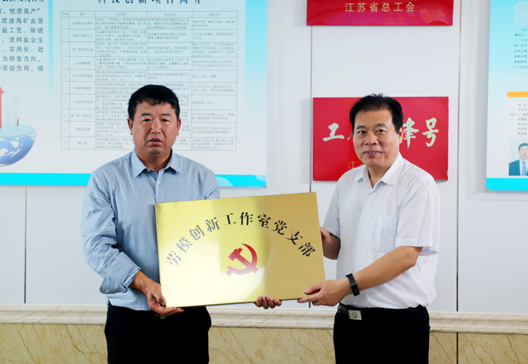 在日晒制盐公司新河分公司的安树林劳模创新工作室现场,丁书记一行观看了技术创新成果展示专题片,还为工作室的“劳模创新工作室党支部”进行了授牌。