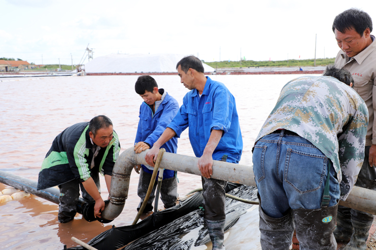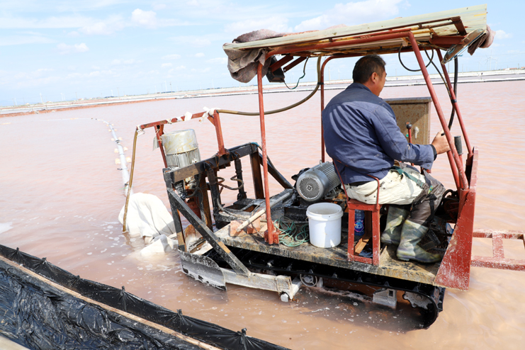 笔者在走访时看到,在新河制盐分公司10班的盐池内,一台轻型自吸式电动履带“T30”正在进行带卤扒盐,大池道上抽盐机泵的轰鸣声回荡在盐滩上,不远处另外几个扒盐机组也在不停的忙碌着。
