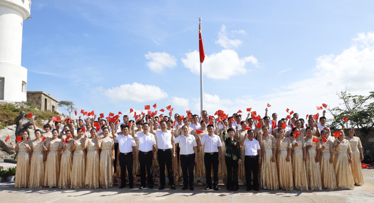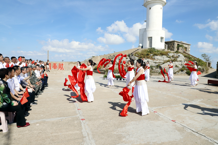 10点35分,升国旗平台成了简易舞台,慰问演出在舞蹈《红红火火大中国》中开始,为开山岛增添了节日的氛围,百名党员一起和唱了《我的祖国》一同迎接国庆节的到来。随后在实境课堂一起观看了《孤岛32年》,通过影片学习王继才同志对党忠诚、矢志报国的政治品格,学习他一诺千金、终身不悔的朴素情怀,学习他立足平凡、追求崇高的人生境界,学习他扎实工作、默默无闻的奉献精神。