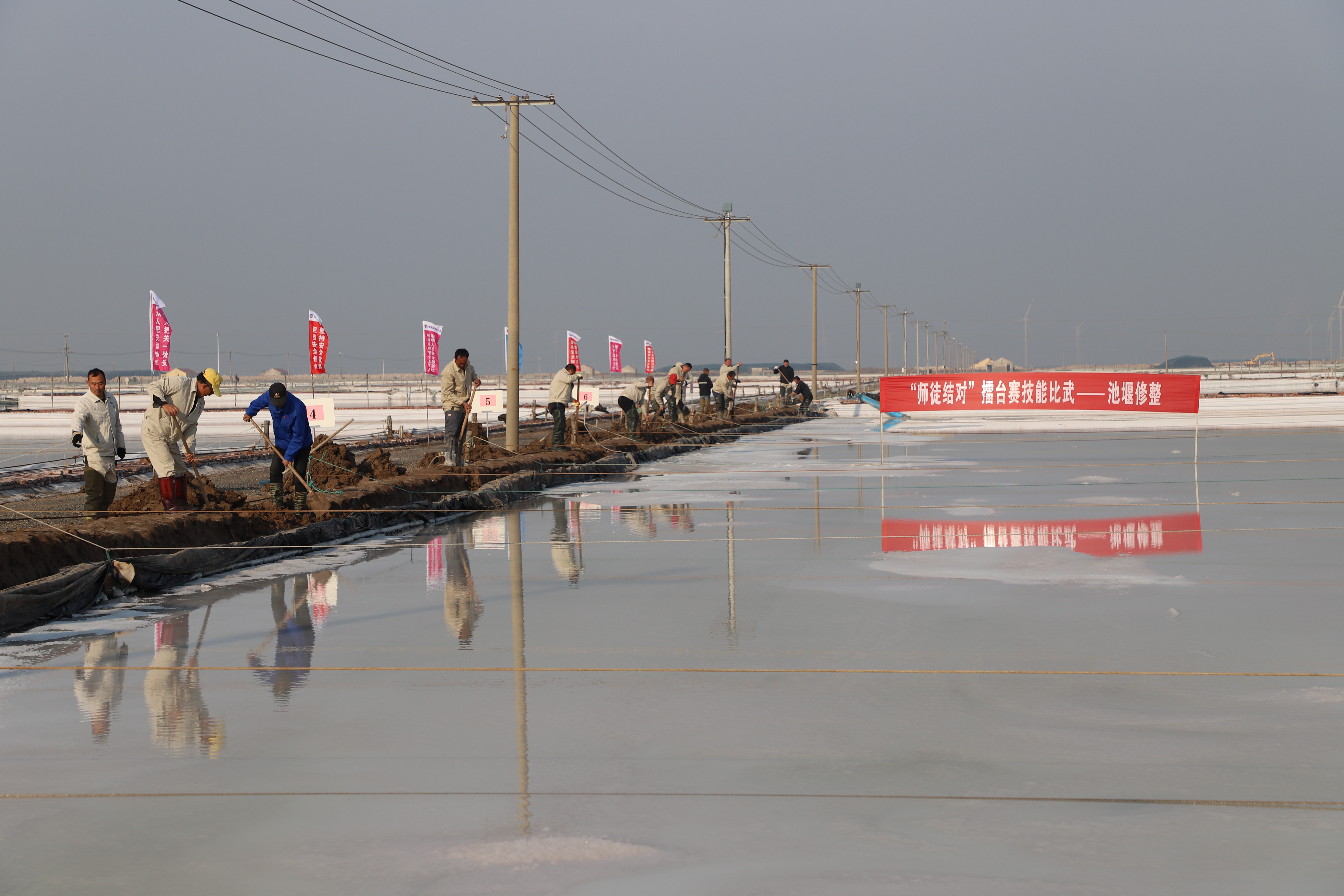 寒冬时节,暖阳之下,盐廪之旁,晒得黝黑的盐场产业工人们按照竞赛的考核标准,做熟泥、打堰墙、做堰顶,护埝顶、夯埝坡、清塘底,由此,见证了一场技能比拼的盛会。