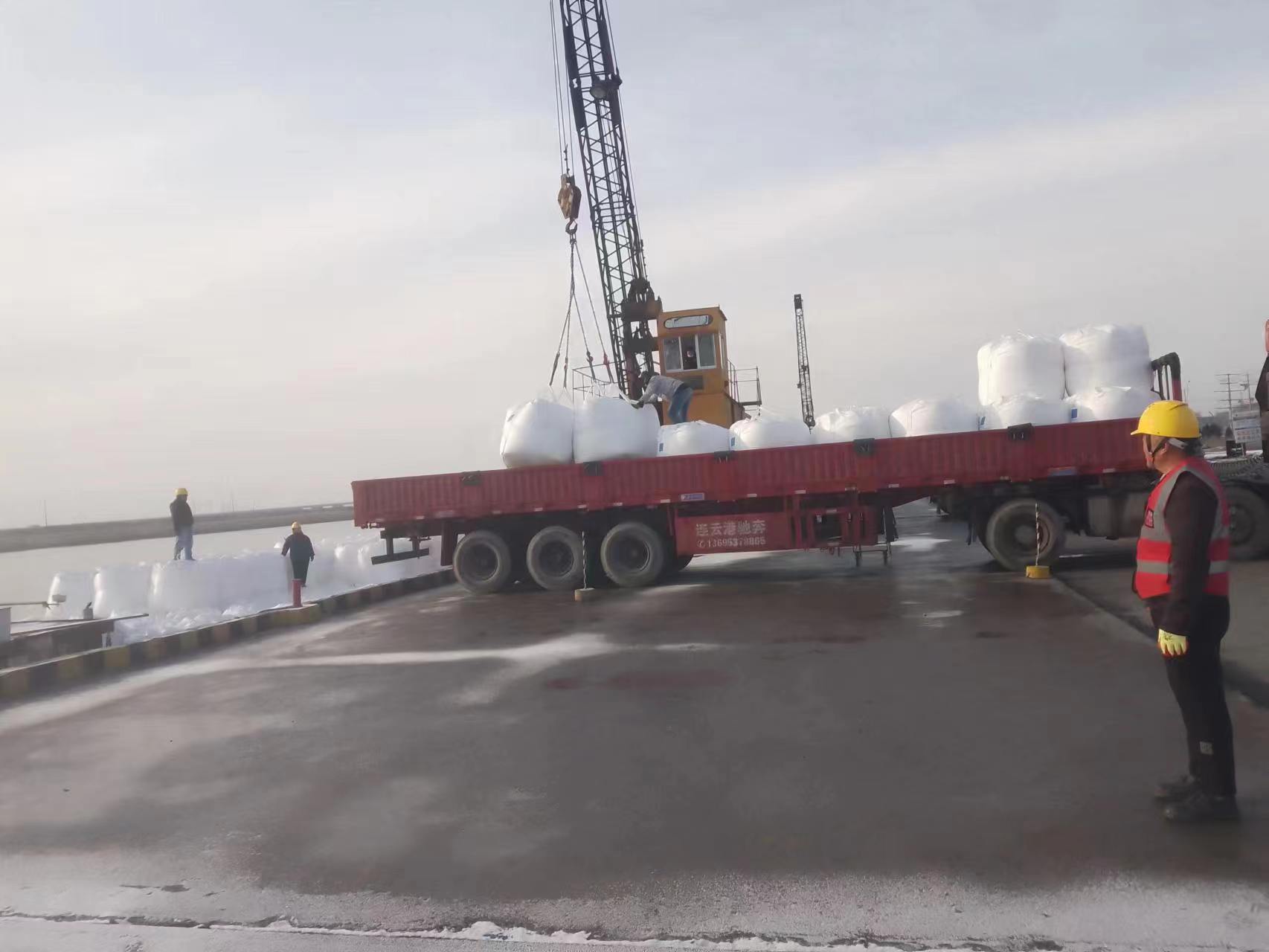 一个个白色的大包被吊装到停靠在码头的货船上,装卸员工在热火朝天的忙碌着,从卸船、装车、挂钩、堆码,每个环节都细致入微。在码头一号塔吊的作业现场,土方驳运也在施工操作,挖掘机舞动长臂,旋转作业,机械设备有序运转,轰呜不息,安全员在现场管理,不时发出指令作业,做好土方验收的同时,提醒驾驶员在雨雪天气,注意防滑,安全行驶,为顺利完成年度100万吨吞吐量奠定坚实的基础,同时夯实来年码头高质高效生产。(胡秀同)