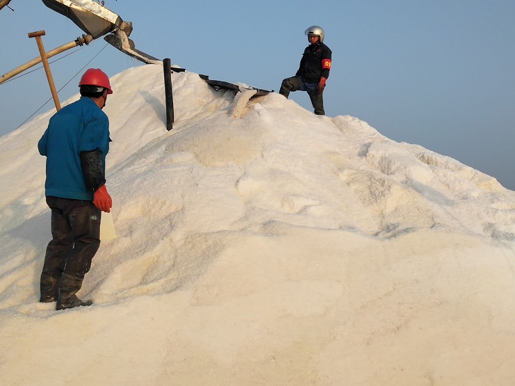 3月3日,日晒制盐埒南分公司5台扒盐机组全面响机收盐,白色盐田安全警示彩旗飘飘,破碴机穿梭往来,一片繁忙景象,收盐机好似一条贪吃蛇,在盐池里缓缓收盐,大廪里一条白练倾泻而下,堆砌成一座座银山。