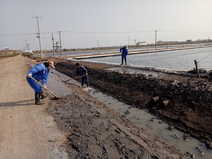 近日,继实业公司海盐基地三个班组整治、清除大米草之后,分公司各个班组现进入捞沟做埝阶段工作。 海盐基地三个班组,每班集中人力从门面沟开始做起,依次咸头、甜头。走进滩头,大家手握铁锨有挖泥的、踩泥的、浇水的、抹平的,干得热火朝天。下步将进入和格压格阶段工作。(实业公司)