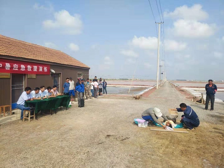 为了贯彻落实灌西投资公司“安全生产月”活动,7月9号在埒南制盐分公司八班举行应急演练,学习中暑急救等安全救援知识。明威公司分管安全领导徐永年与安全员胡继军参与演练学习。(明威 牛莹)