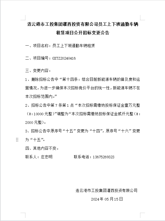连云港市工投爱体育首页(中国)网页版灌西投资有限公司员工上下班通勤车辆租赁项目公开招标变更公告