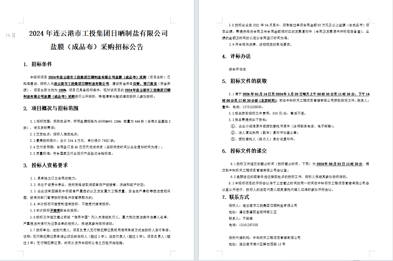 2024年连云港市工投爱体育首页(中国)网页版日晒制盐有限公司盐膜(成品布)采购招标公告