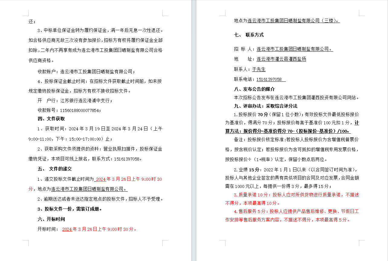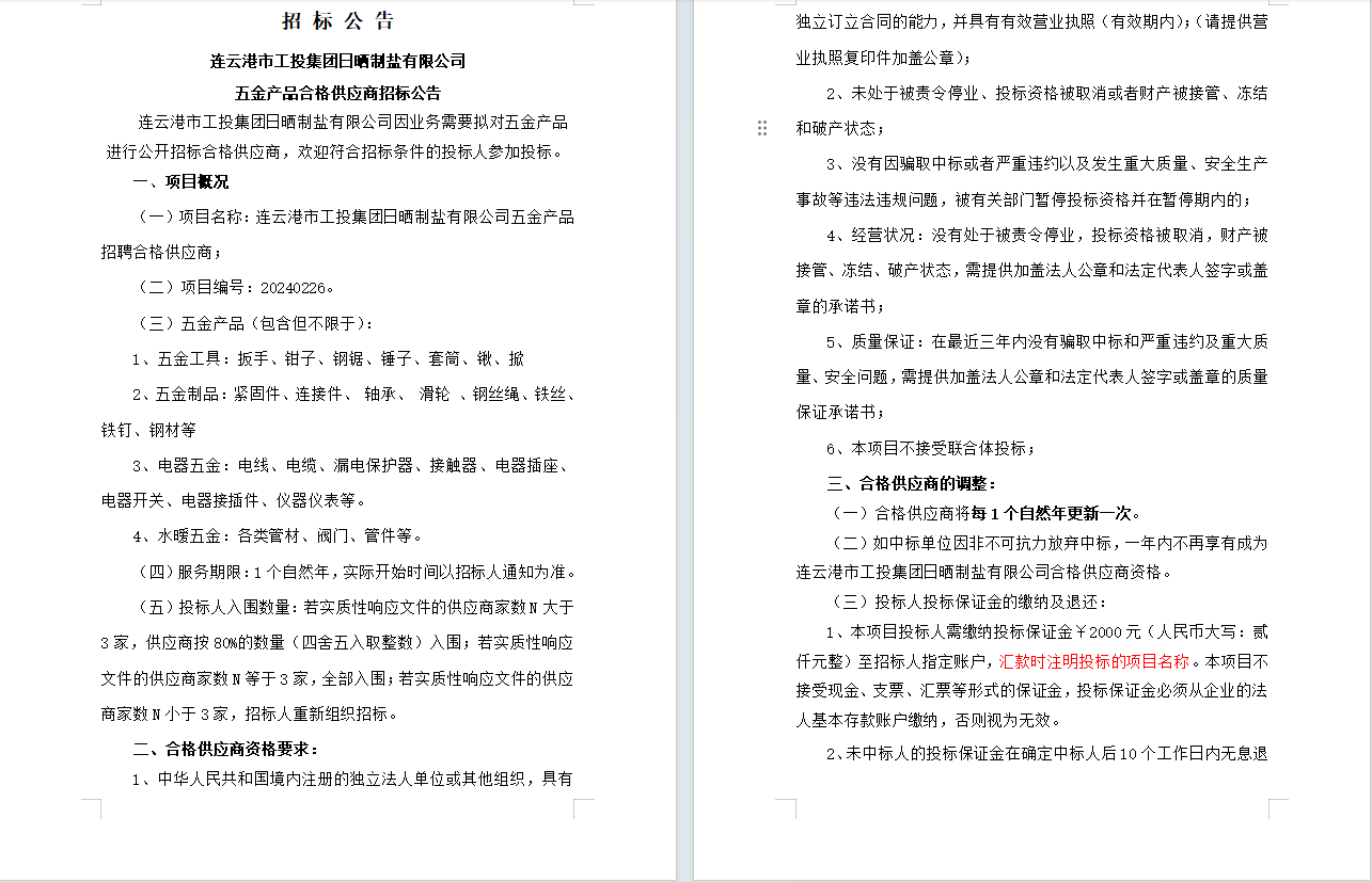 连云港市工投爱体育首页(中国)网页版日晒制盐有限公司五金产品合格供应商招标公告