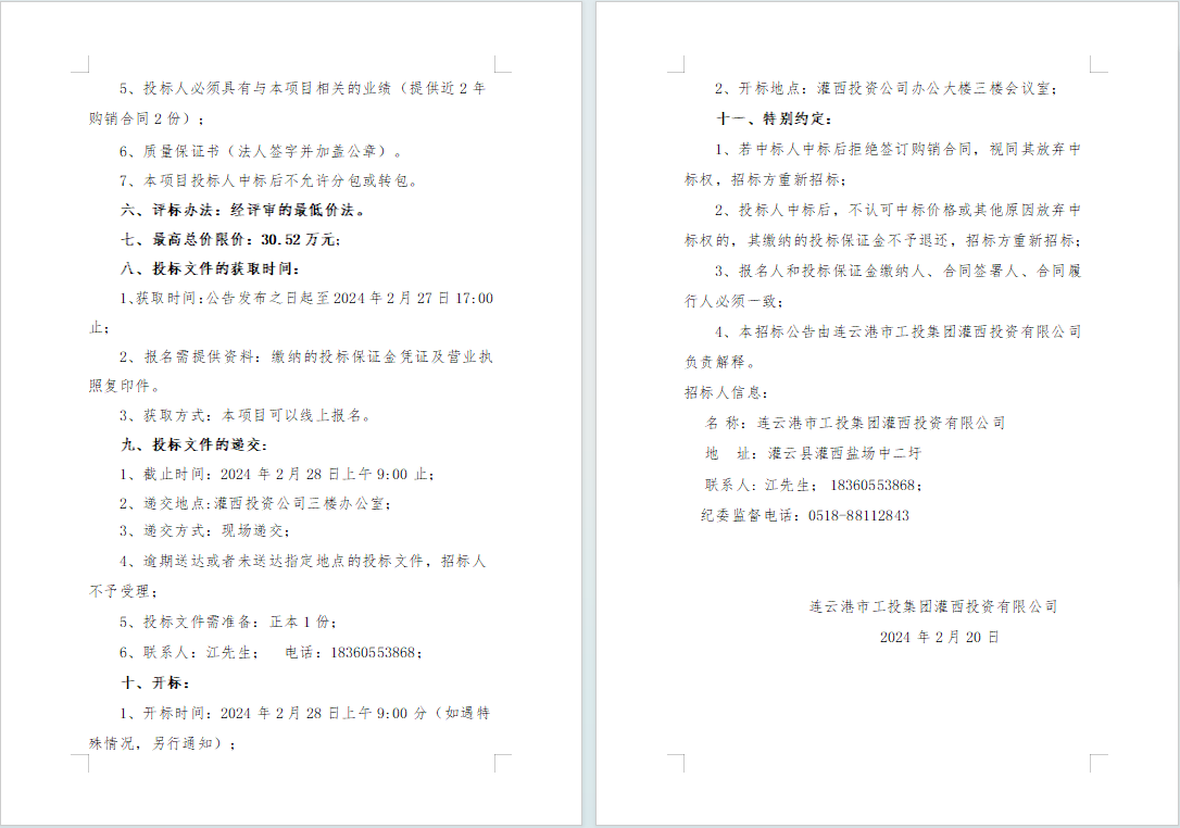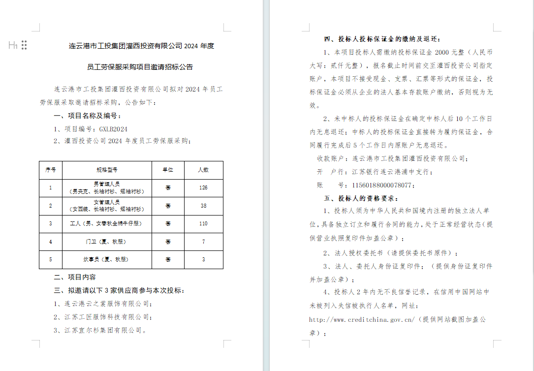 连云港市工投爱体育首页(中国)网页版灌西投资有限公司2024年度员工劳保服采购项目邀请招标公告