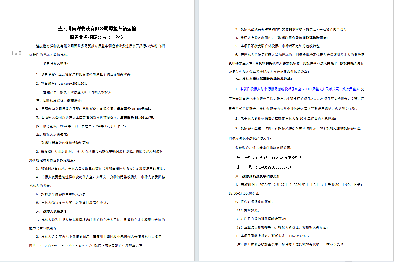 连云港宵洋物流有限公司原盐车辆运输服务业务招标公告(二次)