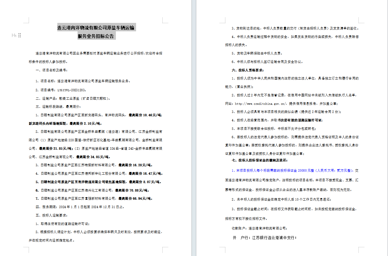连云港宵洋物流有限公司原盐车辆运输服务业务招标公告
