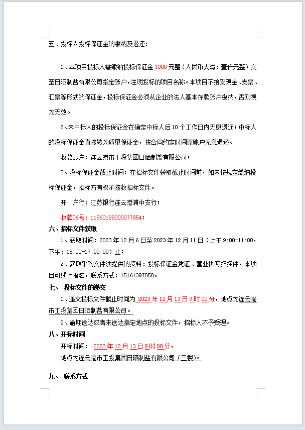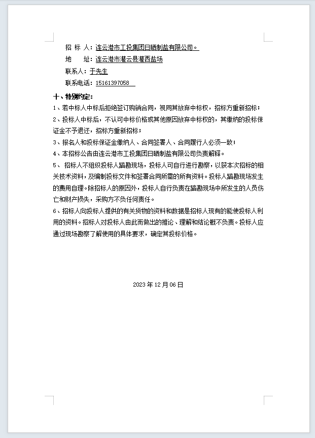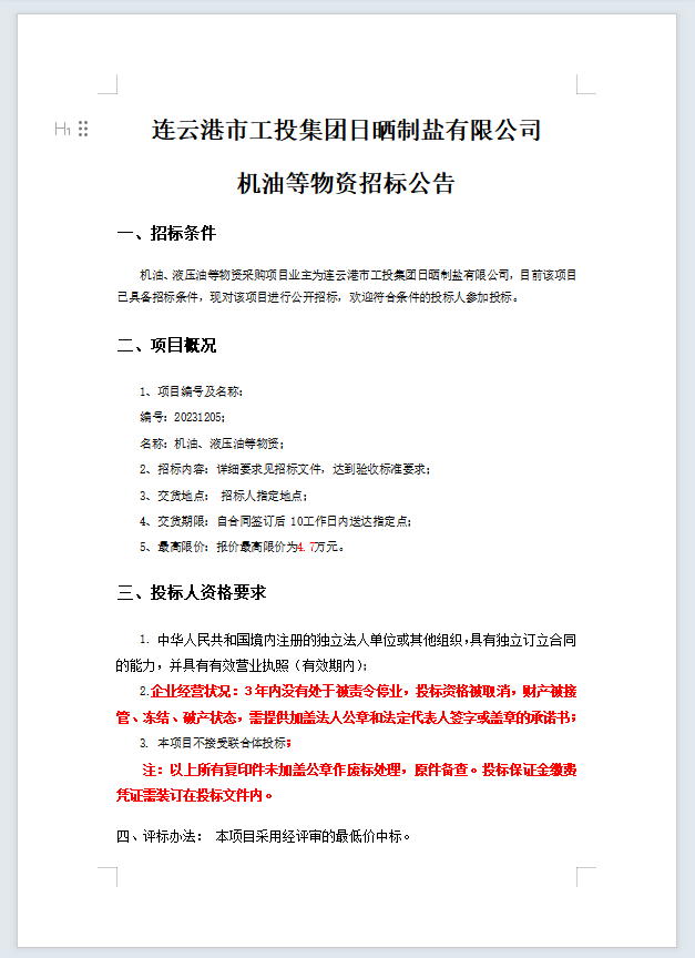 连云港市工投爱体育首页(中国)网页版日晒制盐有限公司机油等物资招标公告