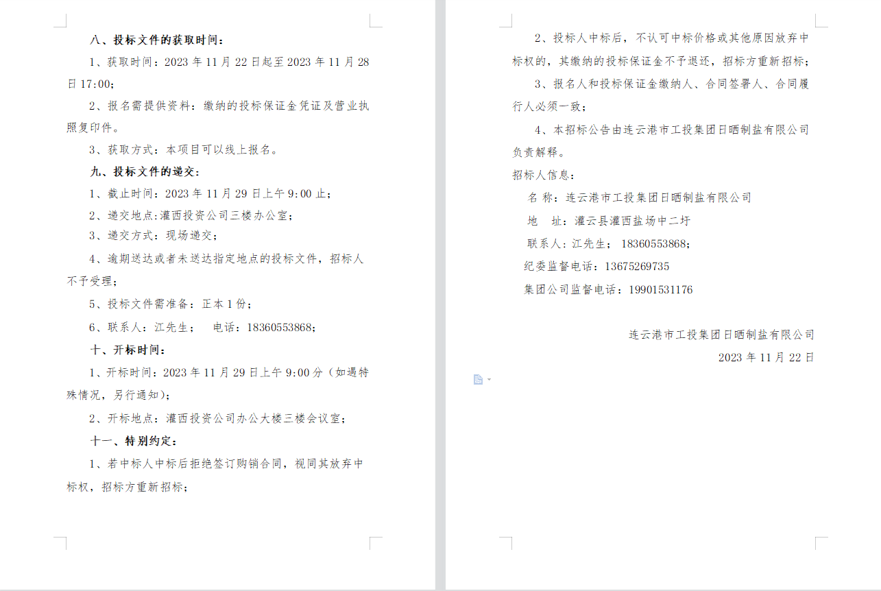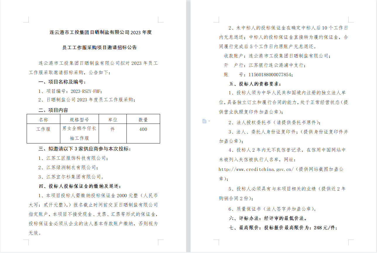 连云港市工投爱体育首页(中国)网页版日晒制盐有限公司2023年度员工工作服采购项目邀请招标公告