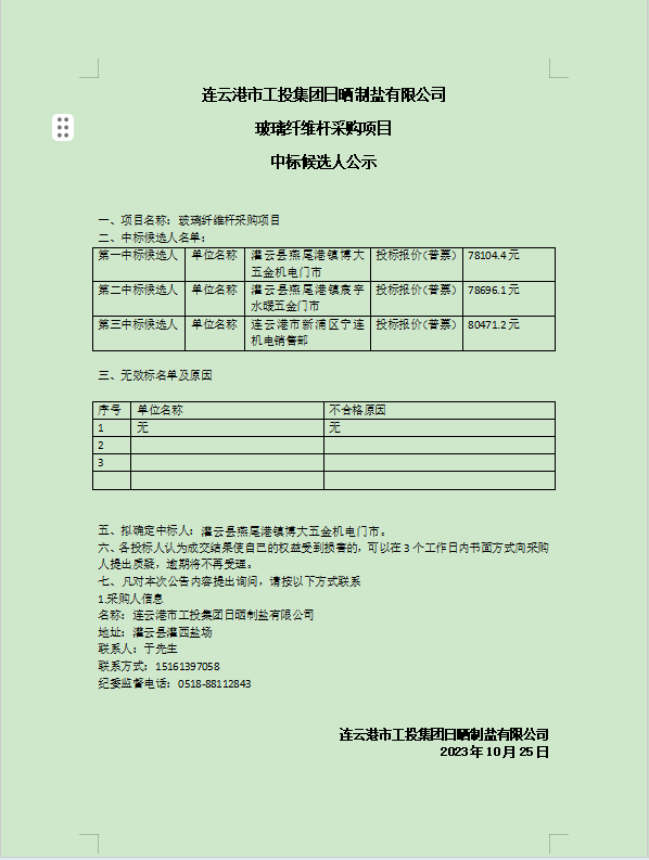 连云港市工投爱体育首页(中国)网页版日晒制盐有限公司玻璃纤维杆采购项目中标候选人公示