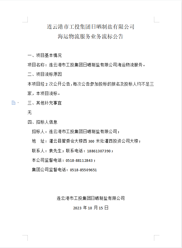 连云港市工投爱体育首页(中国)网页版日晒制盐有限公司海运物流服务业务流标公告