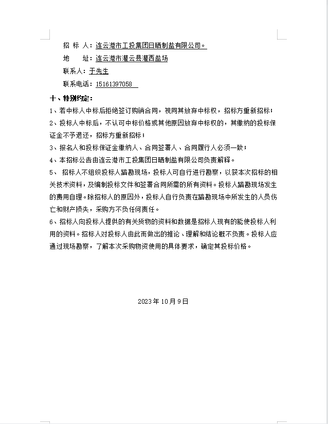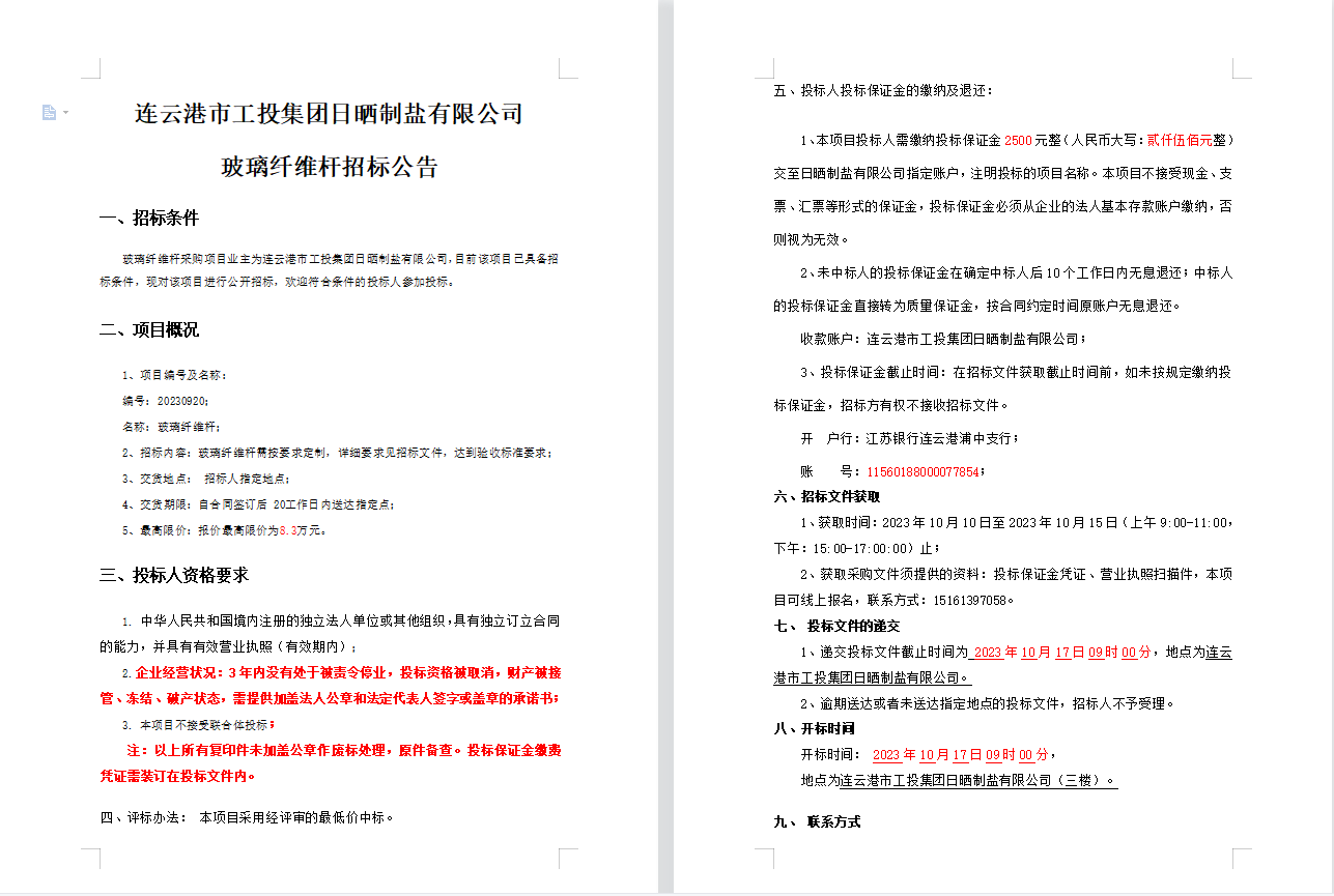 连云港市工投爱体育首页(中国)网页版日晒制盐有限公司 玻璃纤维杆招标公告