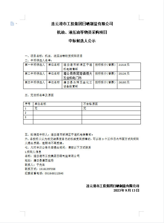 连云港市工投爱体育首页(中国)网页版日晒制盐有限公司 机油、液压油等物资采购项目中标候选人公示