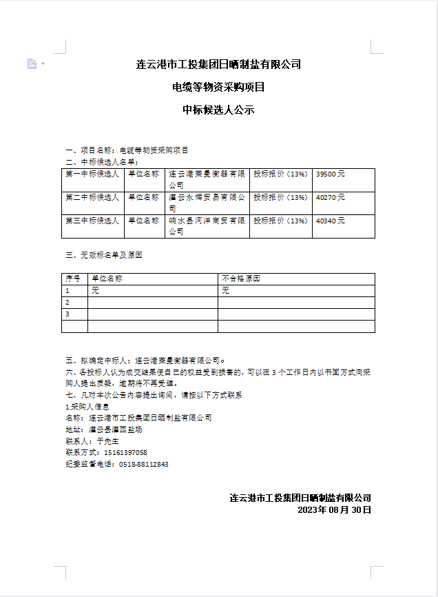 连云港市工投爱体育首页(中国)网页版日晒制盐有限公司电缆等物资采购项目中标候选人公示