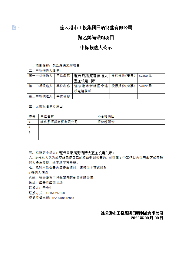 连云港市工投爱体育首页(中国)网页版日晒制盐有限公司聚乙烯绳采购项目中标候选人公示