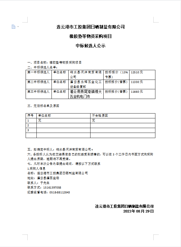 连云港市工投爱体育首页(中国)网页版日晒制盐有限公司橡胶垫等物资采购项目中标候选人公示