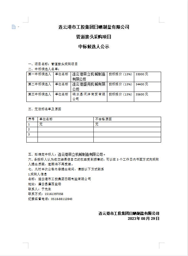 连云港市工投爱体育首页(中国)网页版日晒制盐有限公司 管道接头采购项目中标候选人公示