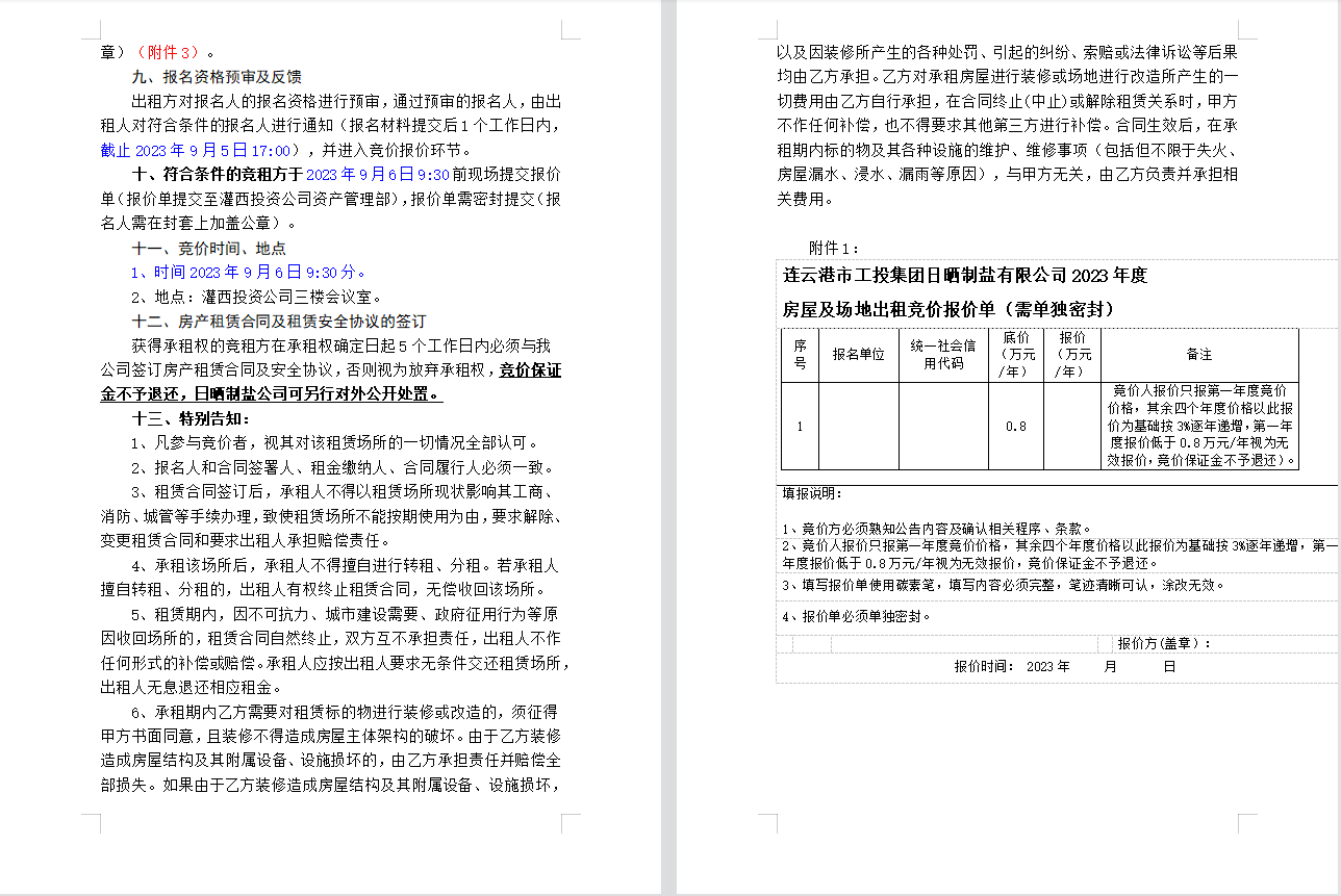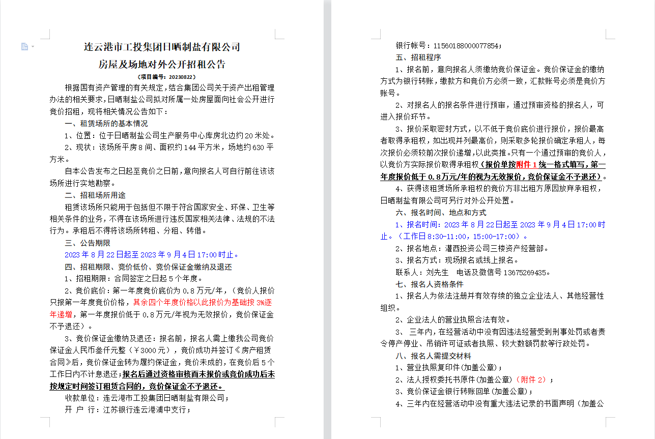 连云港市工投爱体育首页(中国)网页版日晒制盐有限公司 房屋及场地对外公开招租公告