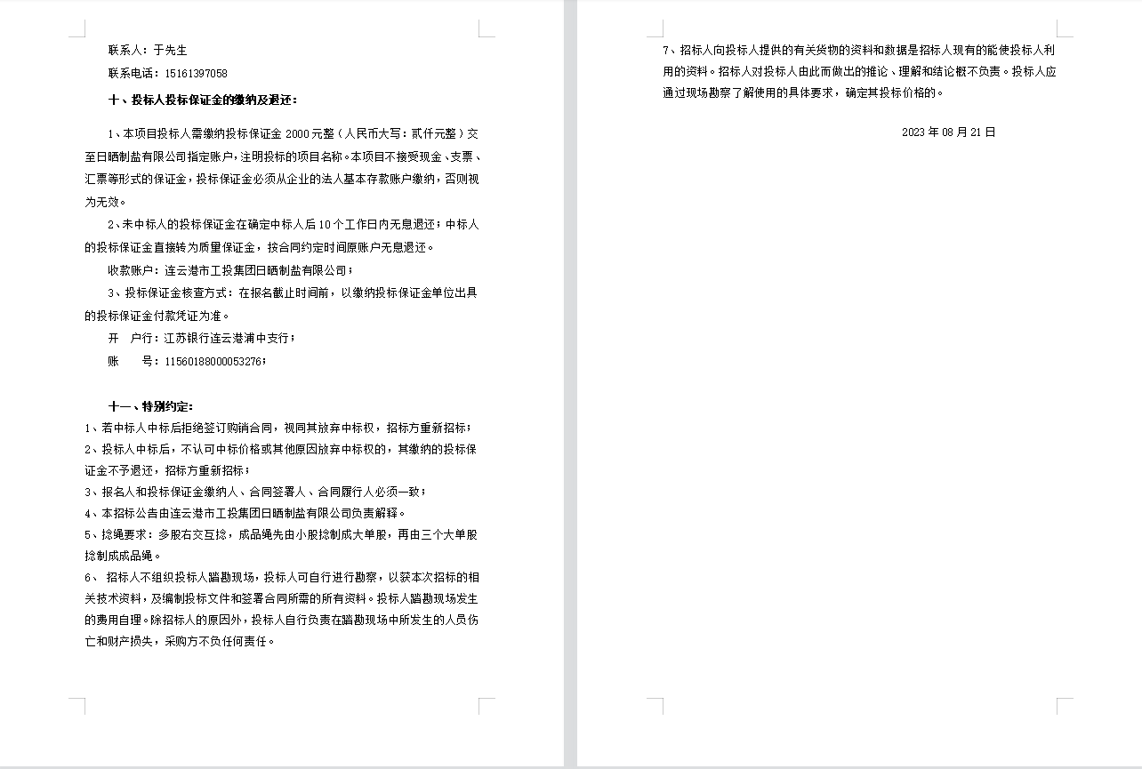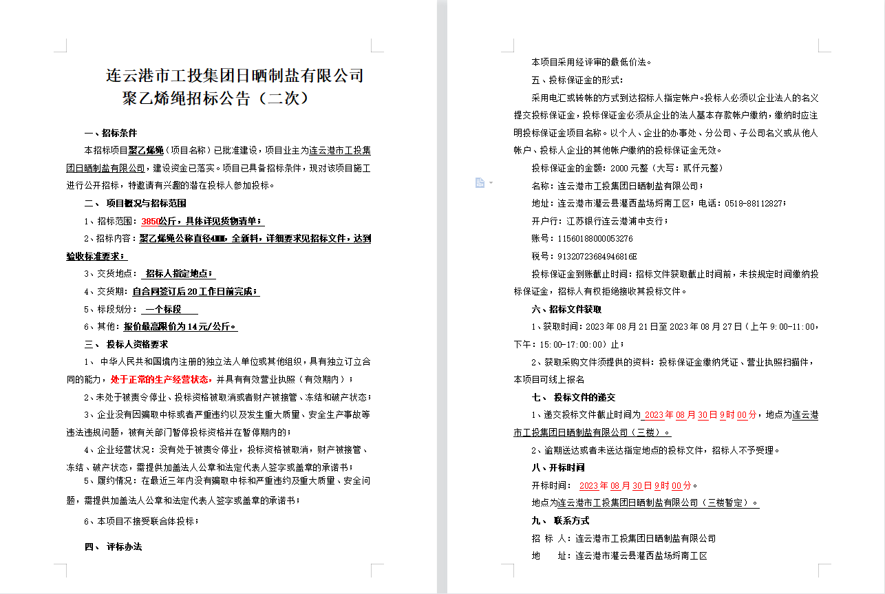 连云港市工投爱体育首页(中国)网页版日晒制盐有限公司聚乙烯绳招标公告(二次)