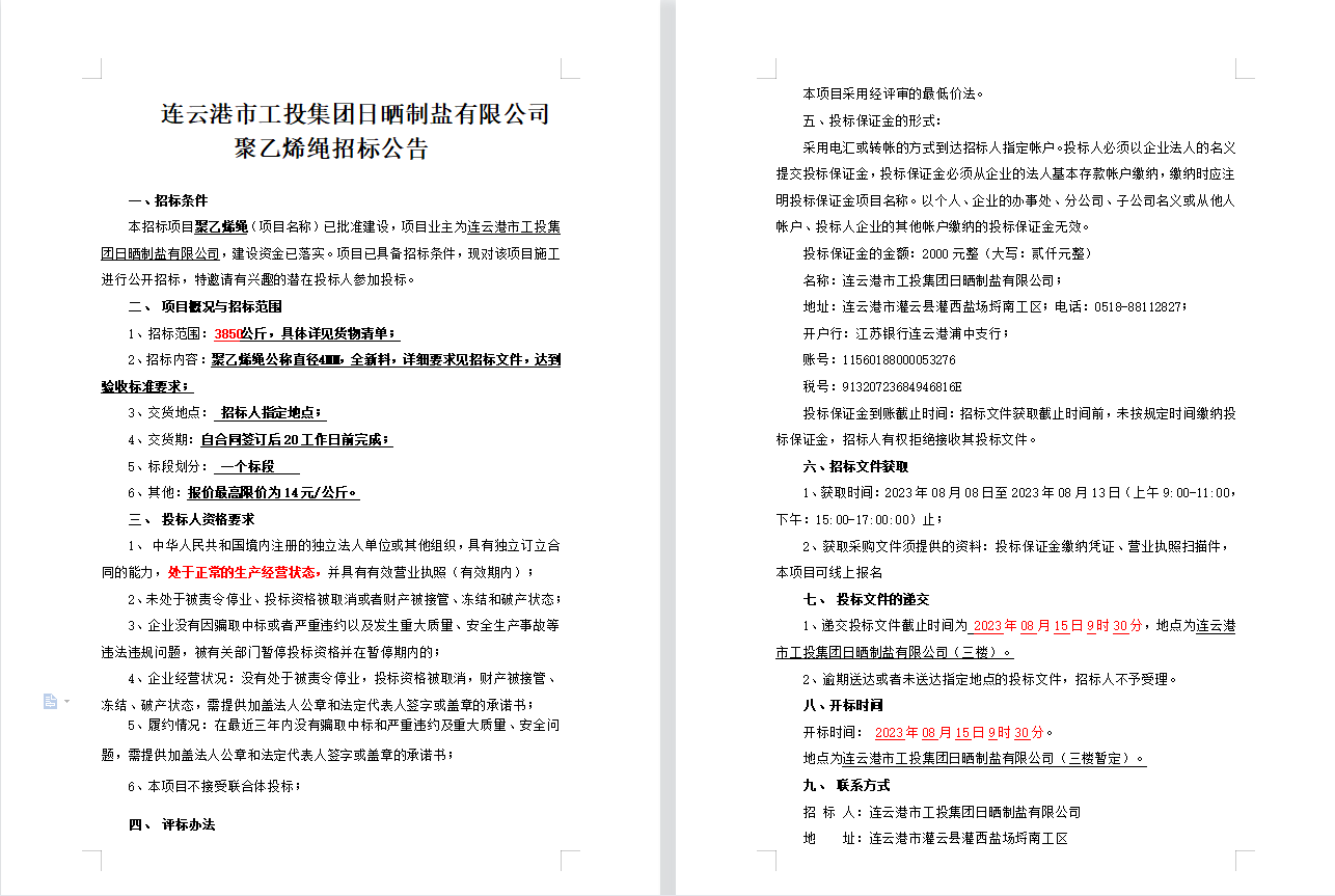 连云港市工投爱体育首页(中国)网页版日晒制盐有限公司聚乙烯绳招标公告