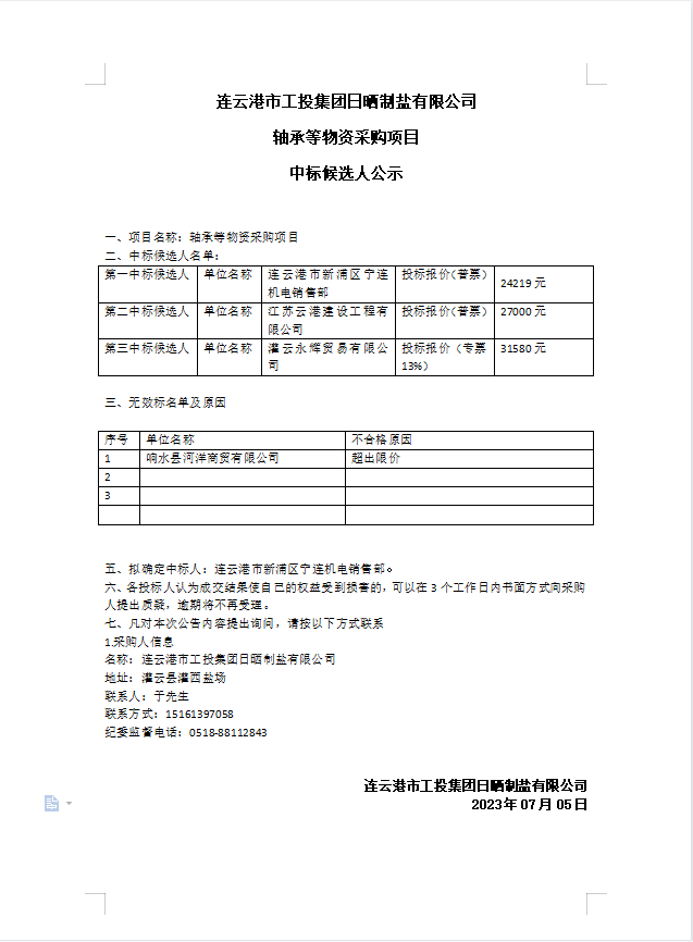 连云港市工投爱体育首页(中国)网页版日晒制盐有限公司轴承等物资采购项目中标候选人公示