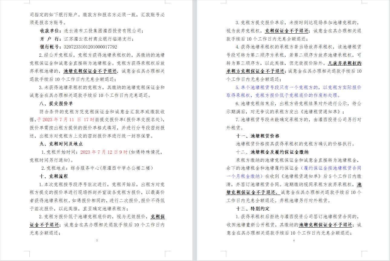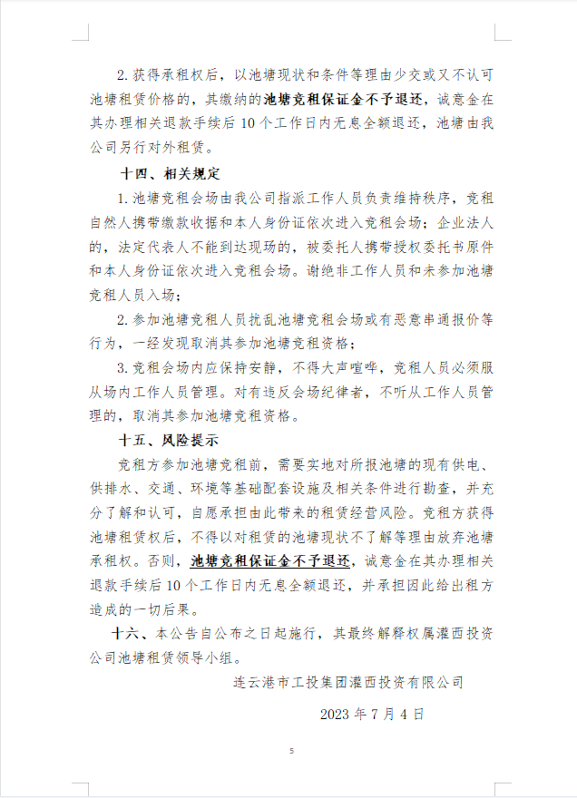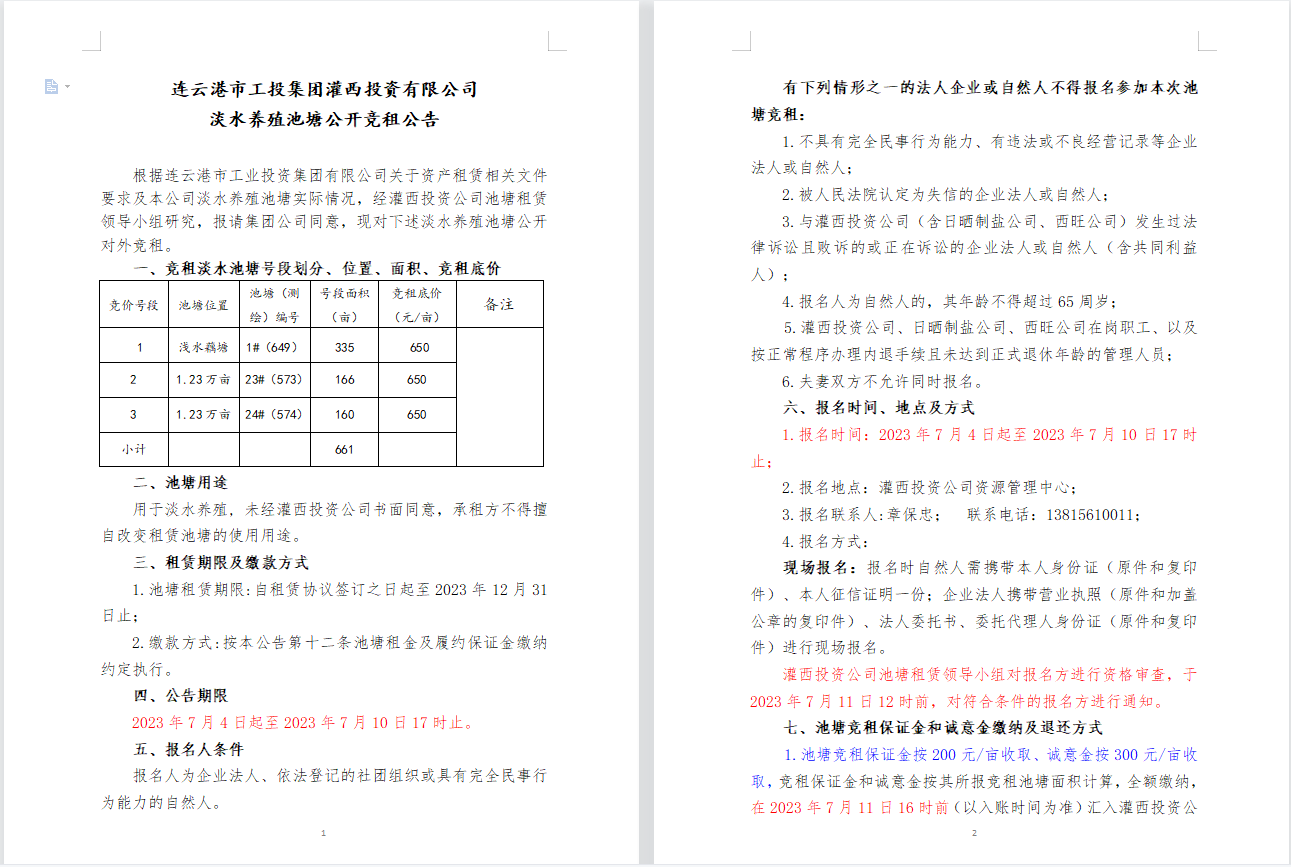 连云港市工投爱体育首页(中国)网页版灌西投资有限公司淡水养殖池塘公开竞租公告