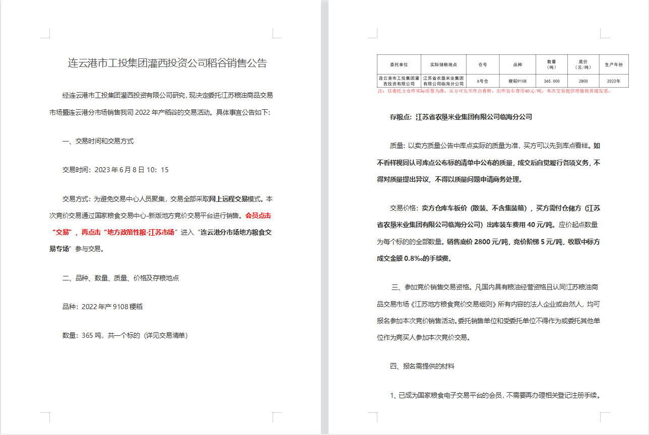 连云港市工投爱体育首页(中国)网页版灌西投资公司稻谷销售公告
